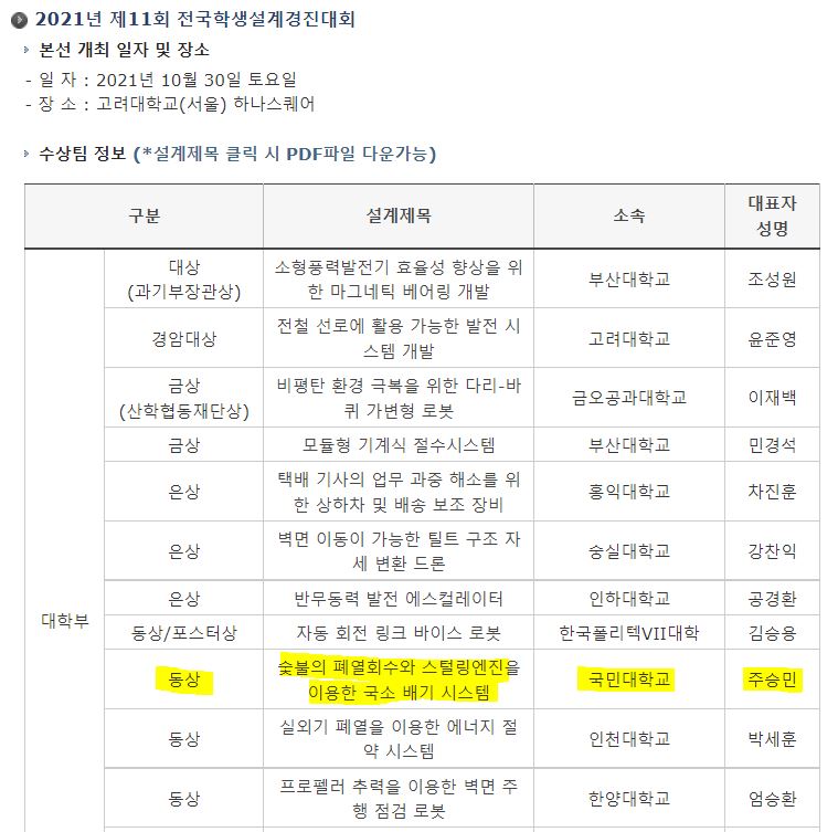 대한기계학회의 전국대학생 설계경진대회에 제가 지도했던 국민대학교 팀이 지난 여름에 출품을 하였고 10월 30일 고려대 하나스퀘어에서 개최된 결선 대회에 진출했고 동상을 수상하였습니다.