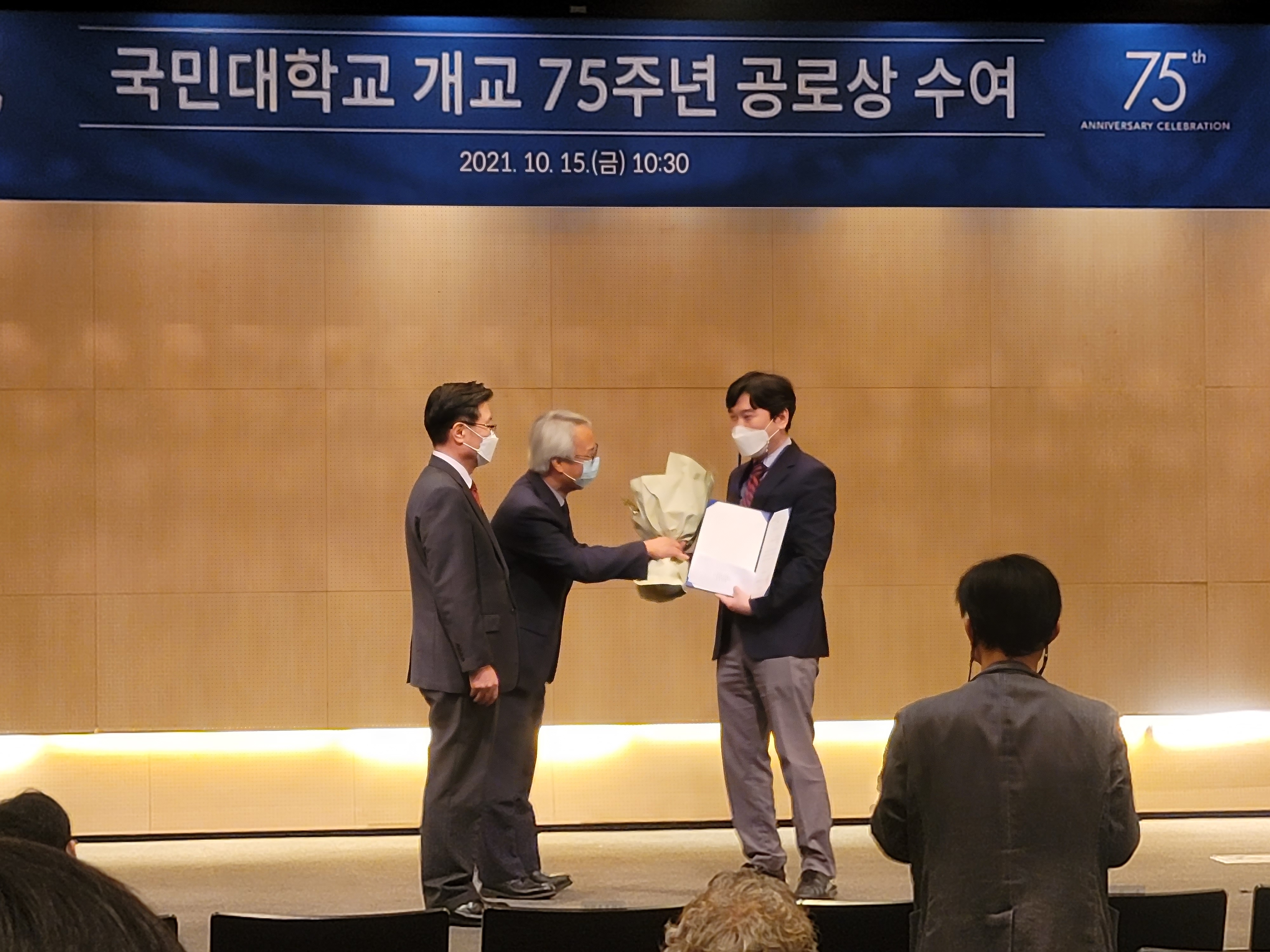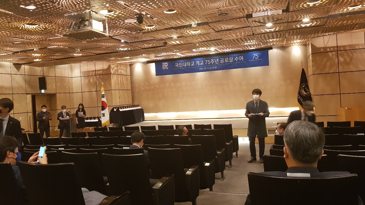 2021년 10월 15일은 국민대학교의 개교 75주년, 국민대의 정릉캠퍼스 이전 50주년, 종합대학 승격 40주년이 되는 날이라고 합니다. 여러 분들 덕분에 연구부문 우수교수상을 수상하였습니다. 시상식장은 이런 분위기였고 사진 왼쪽에 근속 10주년을 맞은 우리과 조백규 교수님 모습이 살짝 보입니다.