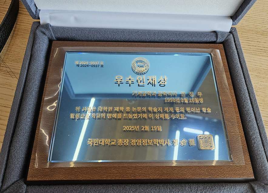 졸업과 함께 좋은 소식도 있었는데 이번에 석사 졸업한 권정우 학생이 졸업식 때 국민대학고 우수 인재상을 수상하였습니다. 우수한 연구 업적을 만들어 SCI 등재 논문 1편, SCOPUS 등재 논문 2편, KCI 등재 논문 2편 등 모두 5편의 우수한 논문을 게재하면서 얻은 결과입니다. 축하드립니다.