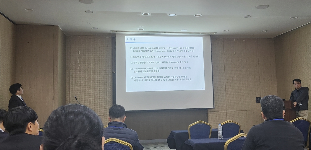 우리 과제 관련해서는 low GWP 냉매에 대한 특별 세션을 구성하였고 장영수 교수님의 사회로 현대, 삼성, LG 등의 대기업에서 low GWP 냉매를 어떻게 적용하고 대응하는 지에 대한 정보를 알 수 있었습니다.
