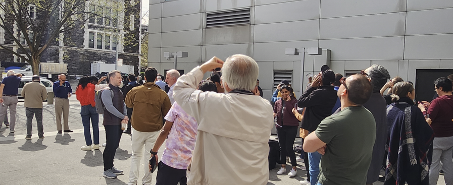 제가 있는 건물은 고딕식 건물은 아니고 옆에 살짝 보이는 현대식 건물입니다. 사진을 직은 날은 개기일식이 있어서 다들 구경하고 있고 저도 안경 하나 구입해서 구경하고 있습니다. 사진 가운데 있는 백발의 교수님은 제가 있는 곳 센터장을 하고 계신 Kawaji라는 일본계 교수님인데 뒷 모습으로는 잘 구분이 안 가지만 턱수염을 기르고 안경을 끼고 계셔서 일본 학생들은 미야자키 하야오 닮았다고들 하는 것 같습니다.