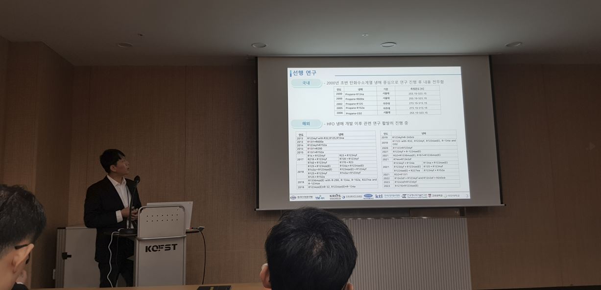 2023년 대한설비공학회 동계학술대회가 과총회관에서 개최되었습니다. 진행중인 대체냉매 에어컨 과제 관련 특별세션이 있었고 기계연구원 김동호 박사님이 발표하고 계십니다. 이어지는 세션에 좌장을 맡아 주셨고 우리 실험실에서는 권정우 군이 발표를 하였습니다. 권정우 군은 이날 우수발표상을 수상하였습니다. 축하드립니다.