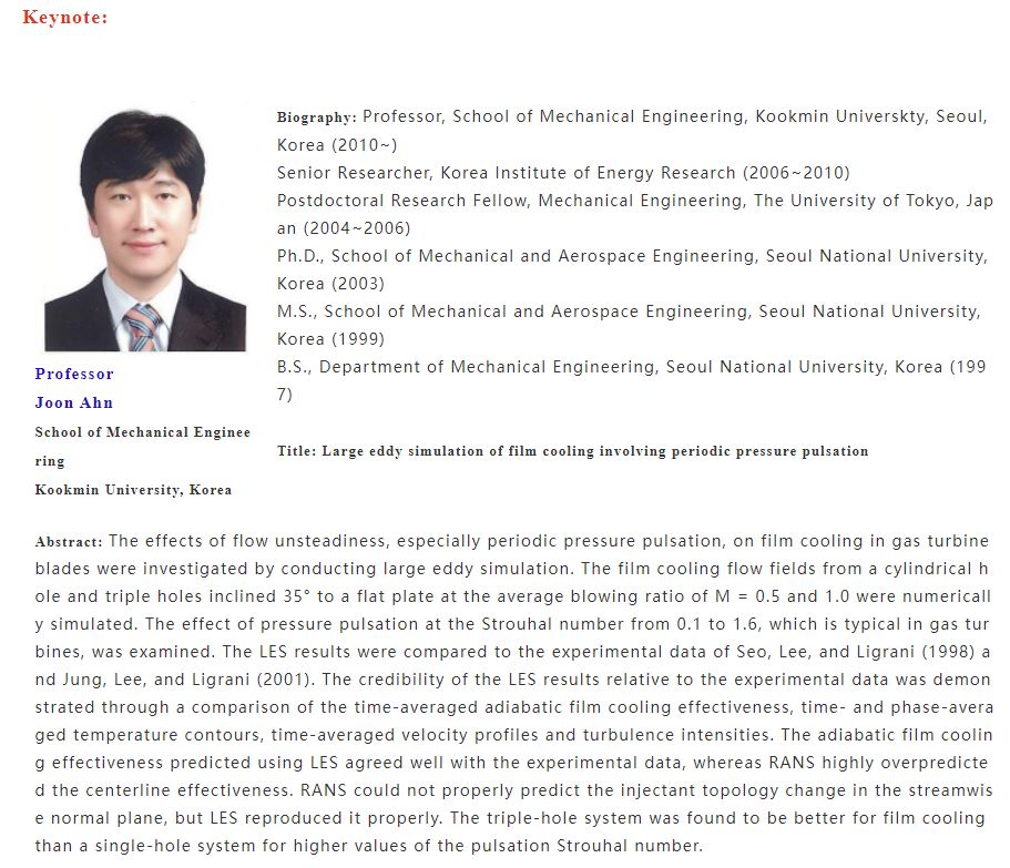 학회 홈페이지에는 이렇게 소개가 되었습니다. 강연 주제는 가스터빈 블레이드의 열전달로 잡았습니다.