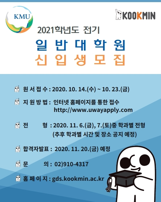 2021학년도 전기 국민대학교 일반대학원 신입생 모집 원서접수가 다음주 수요일에 시작됩니다.